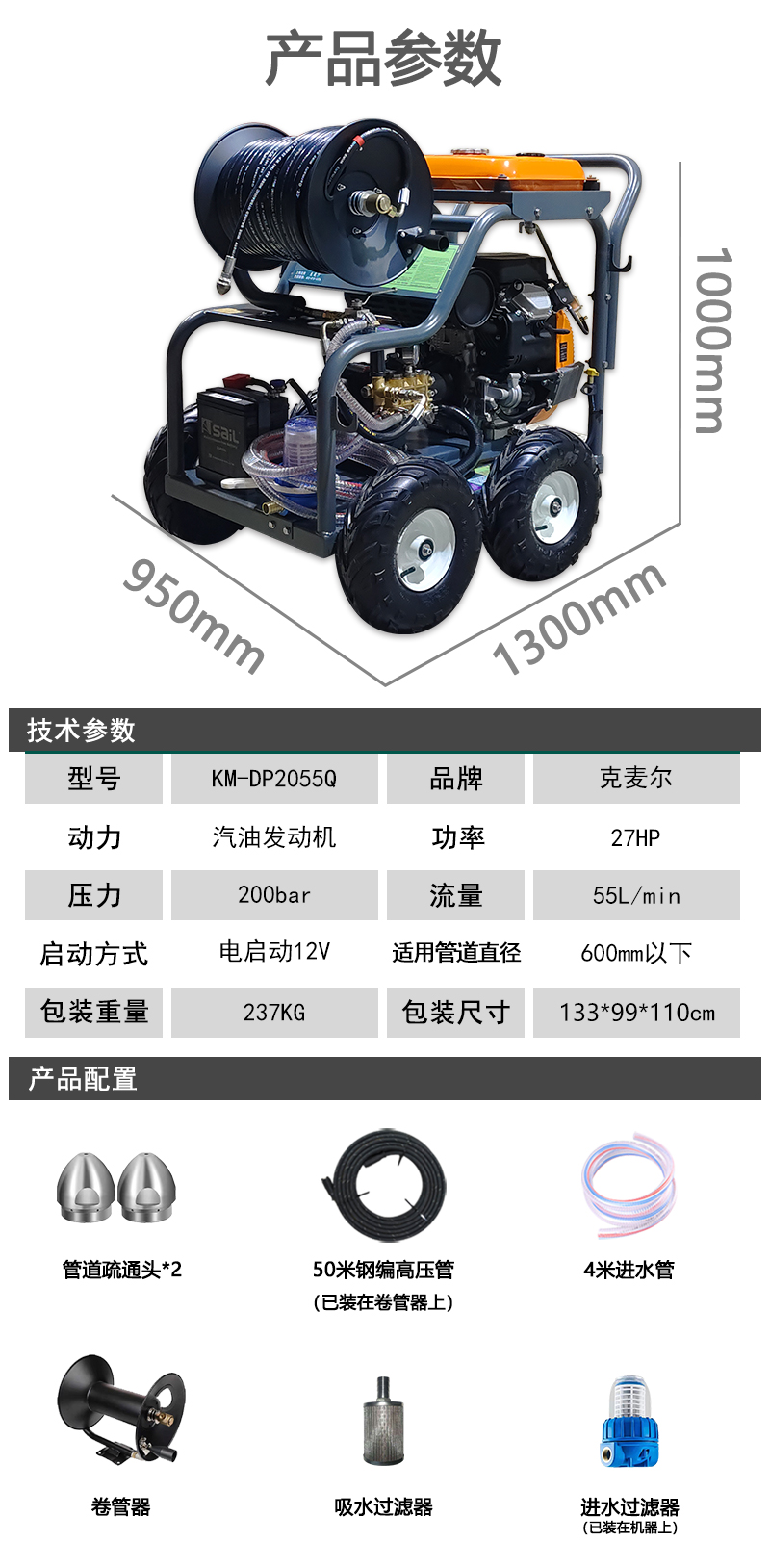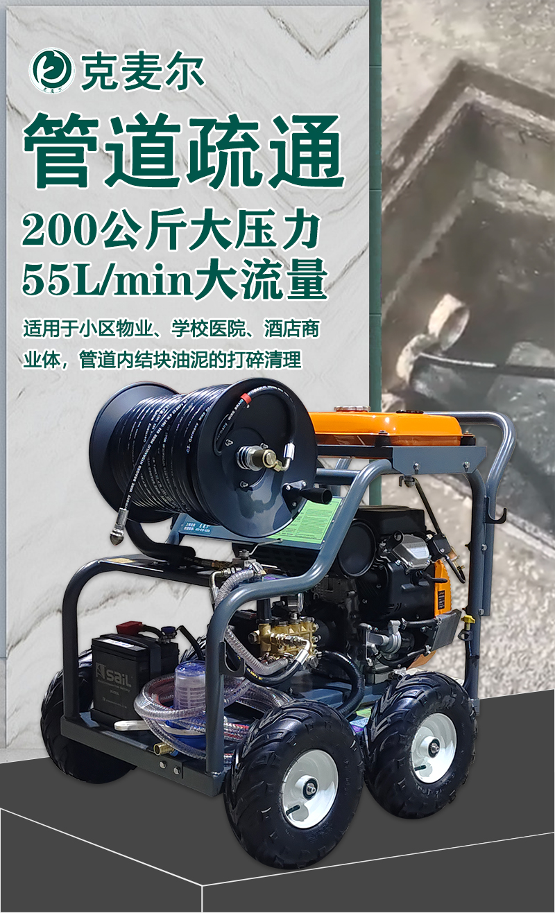 克麦尔高压管道疏通机 KM-DP2055Q 汽油驱动 功率27HP 压力200bar 流量55L/min